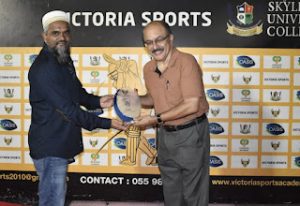 Receiving a memento from Shabir Pardiwala, Managing Director of Victoria Cricket Academy (left)