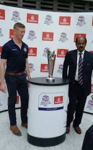Keaton Jennings of Lancashire and Kuzhikkatt Sreekumaranunni (right) pose with the T20 World Cup