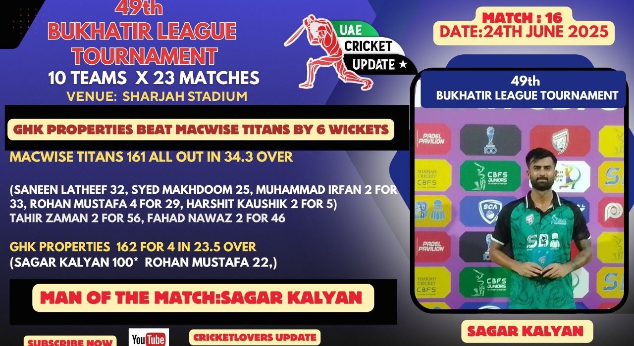 Sharjah. Sagar Kalyan, well known for his tall scores in UAE’s domestic cricket, announced his return to form with an unbeaten 100 to steer GHK Properties to a six-wicket win over Macwise Titans in the 49th Bukhatir League, sponsored by Seven Districts, at the Sharjah Cricket Stadium on Tuesday. Kalyan, who loves to go for his shots, hit his century off 74 balls, with 11 boundaries and four sixes. This helped GHK reach the target in just 23.5 overs.
