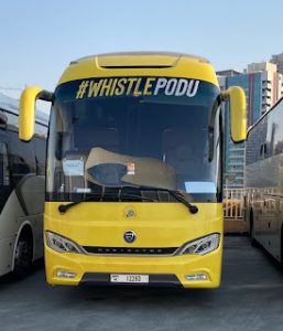 Chennai Super Kings team bus with their slogan ‘Whistle Podu’