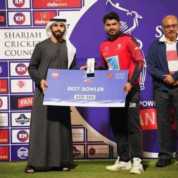 Khalaf Bukhatir presents the best bowler award to Muhammad Azhar for a CBFS tournament. Yours sincerely is next to Azhar.