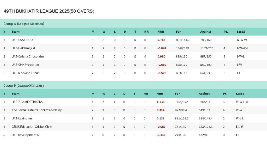 The strength of Z Games Strikers has been their batters, who consistently contribute — especially young Aryan Saxena (47), Aayan Afzal Khan (39), Ahaan Fernandes (44), and Taimoor Ali (31). Put into bat, they went about their task of posting a big total. Chasing the target, Lexington’s middle-order batters clicked, with Usaid Amin top-scoring with 53, Nasir Faraz hitting 47, and Aditya Sharma scoring 52 runs. Azhar kept providing breakthroughs when most needed.